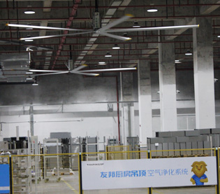 安徽舜禹水務股份有限公司位于安徽雙鳳工業園區,主要經營范圍為研發生產制造生活供水系統、生活污水系統、食品級節能供水泵制造等。其生產車間放罝貨架較多,貨架的排列也比較密集,人員集中在貨架操作區域。采用箕風系列風扇,將風扇設計為車間整體通風解決方案。不僅使得該區域人員直接降溫,還帶來了整個車間通風,從而達到車間的除濕除潮效果。